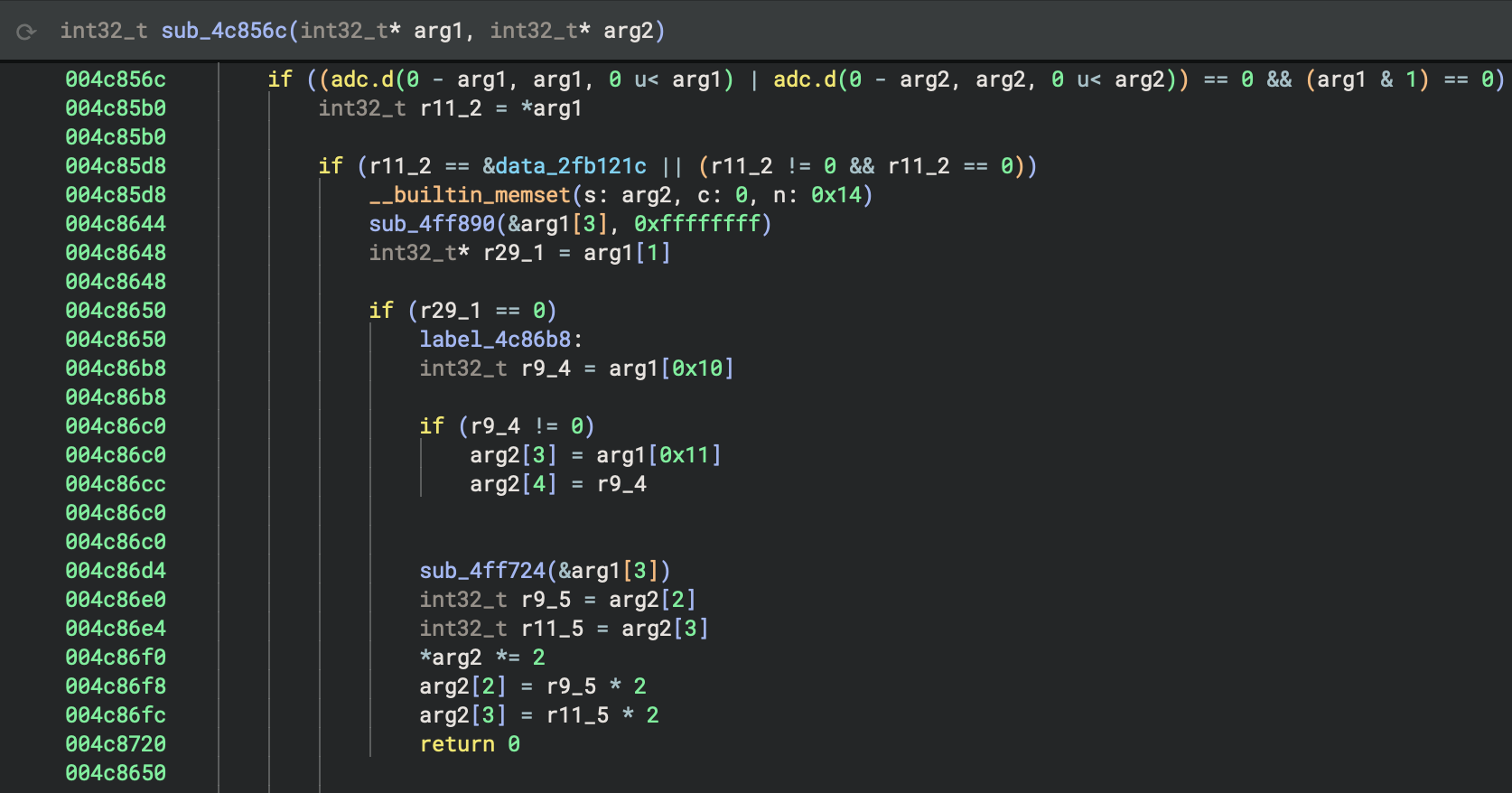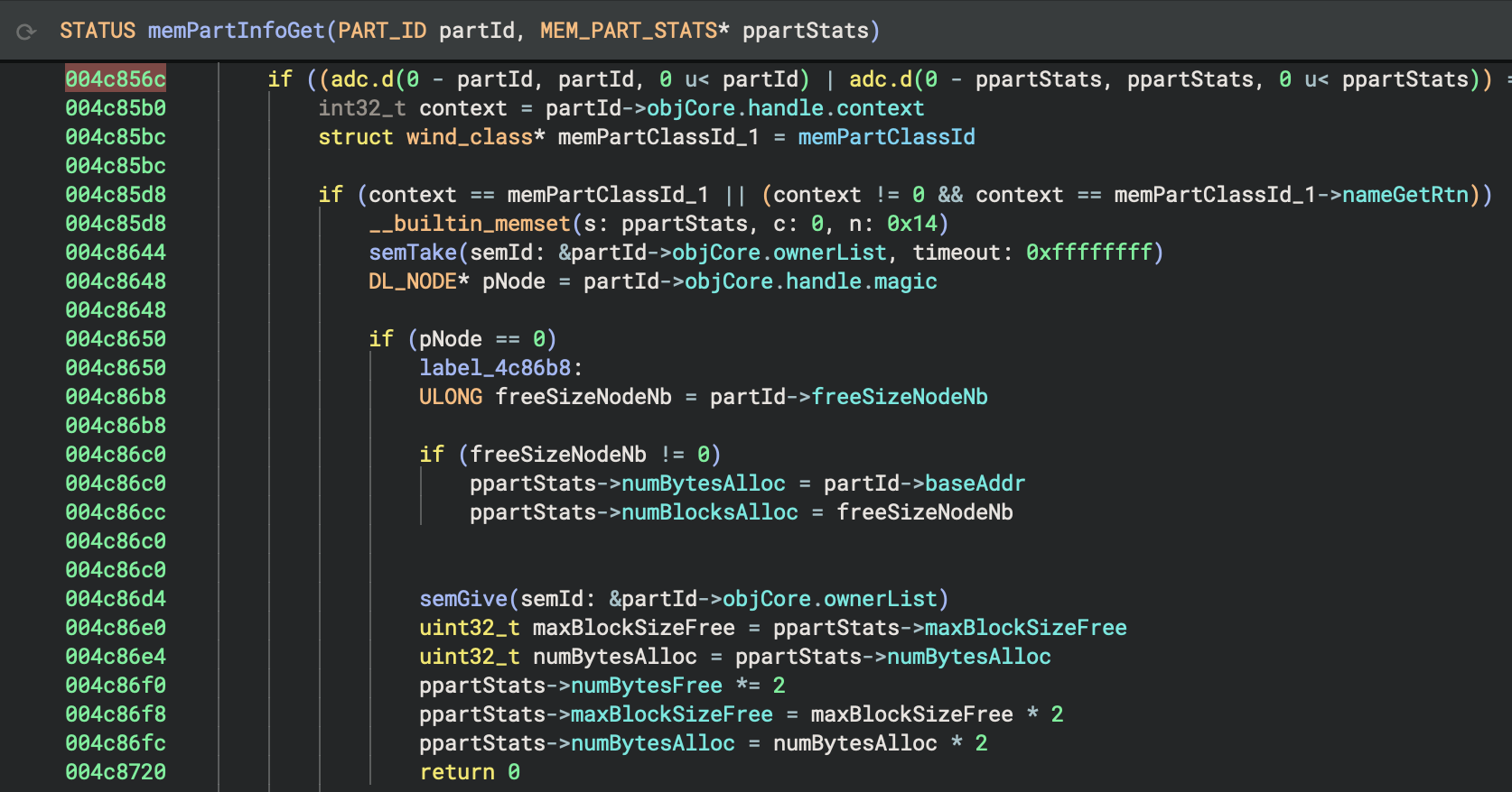 After the VxWorks BinaryView has identified the base address and has created sections from symbol entries, it iterates through the symbol entries and applies names to functions and data variables. LLVM and GNU mangled symbol names are demangled to provide a more readable representation. The VxWorks BinaryView also applies types to functions and data variables that are included in the bundled VxWorks platform types, also released in version 4.2 of Binary Ninja Ultimate. Binary Ninja bundles hundreds of types for VxWorks kernel functions and data structures. These types contribute to more accurate analysis and decompilation of VxWorks images. The screenshots below show the difference in decompilation between a VxWorks image loaded with the Mapped BinaryView and no type information and the same image loaded with the VxWorks BinaryView and platform types applied.